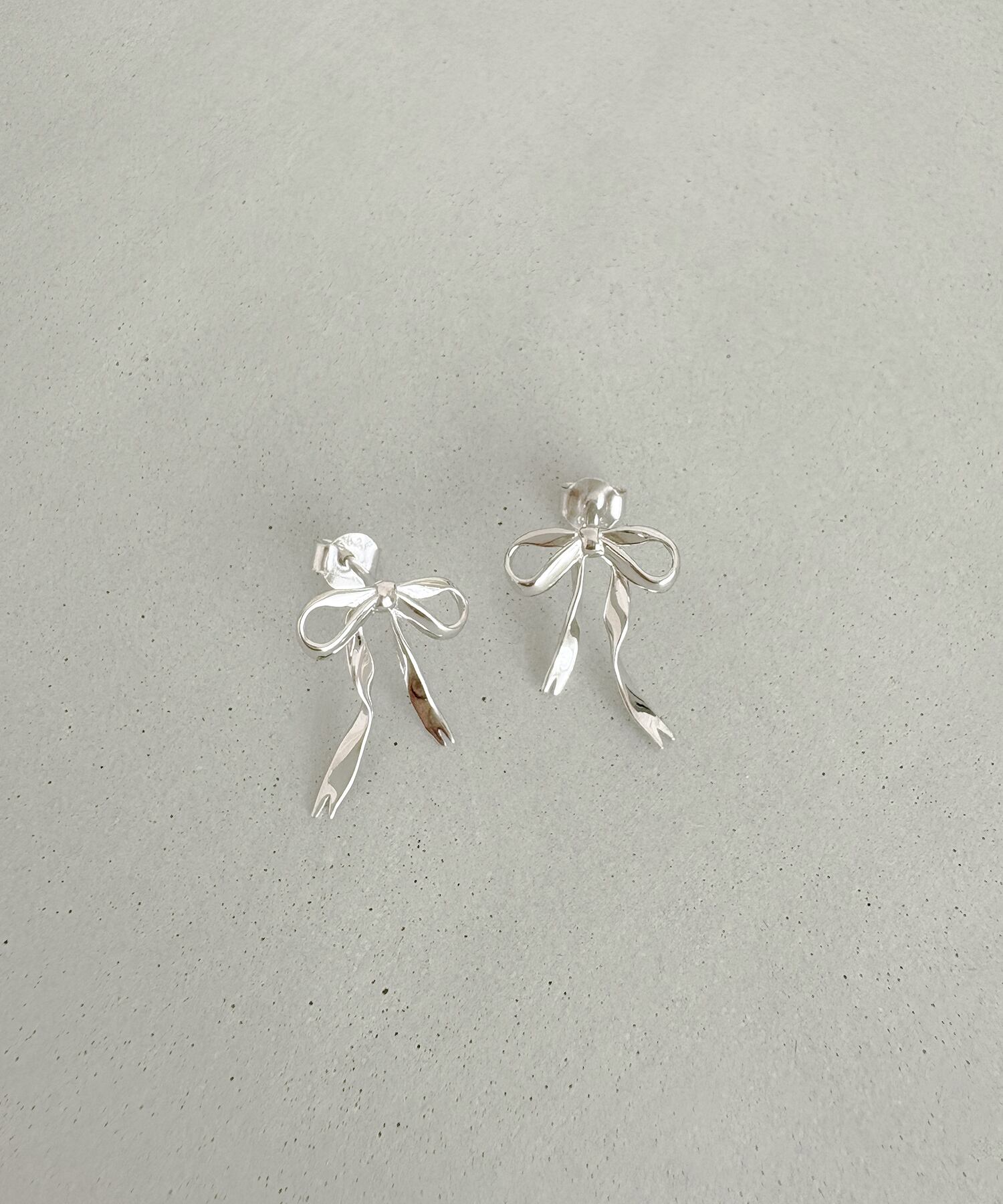 耳元をラッピングするように、そっと結ばれたリボンピアス.