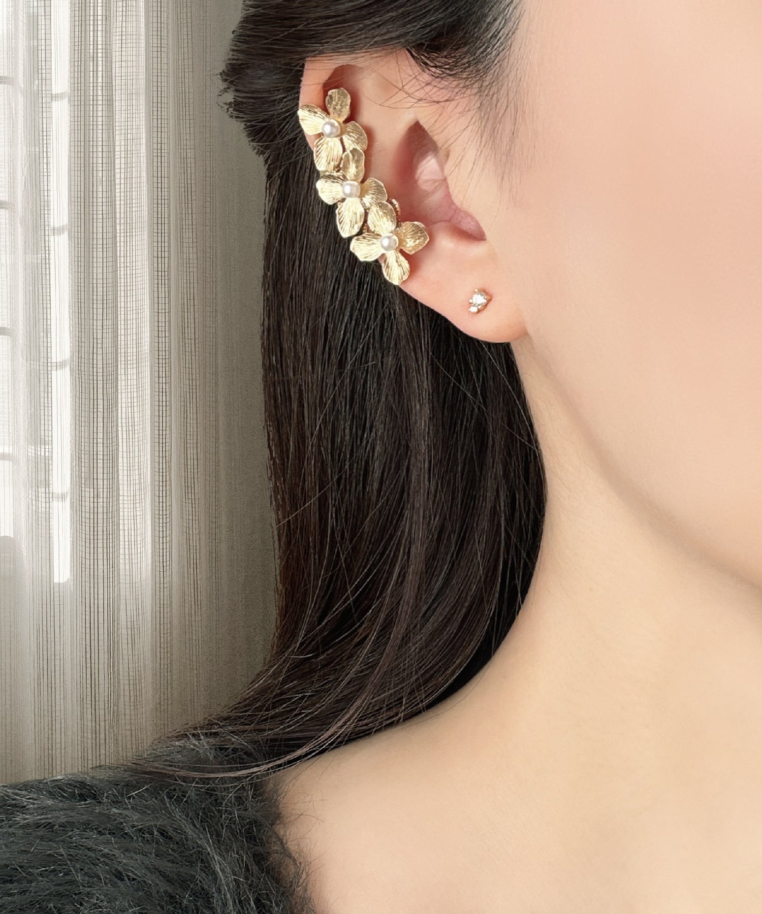 イヤーカフとの重ね付けをすることで、さらに華やかな印象に.