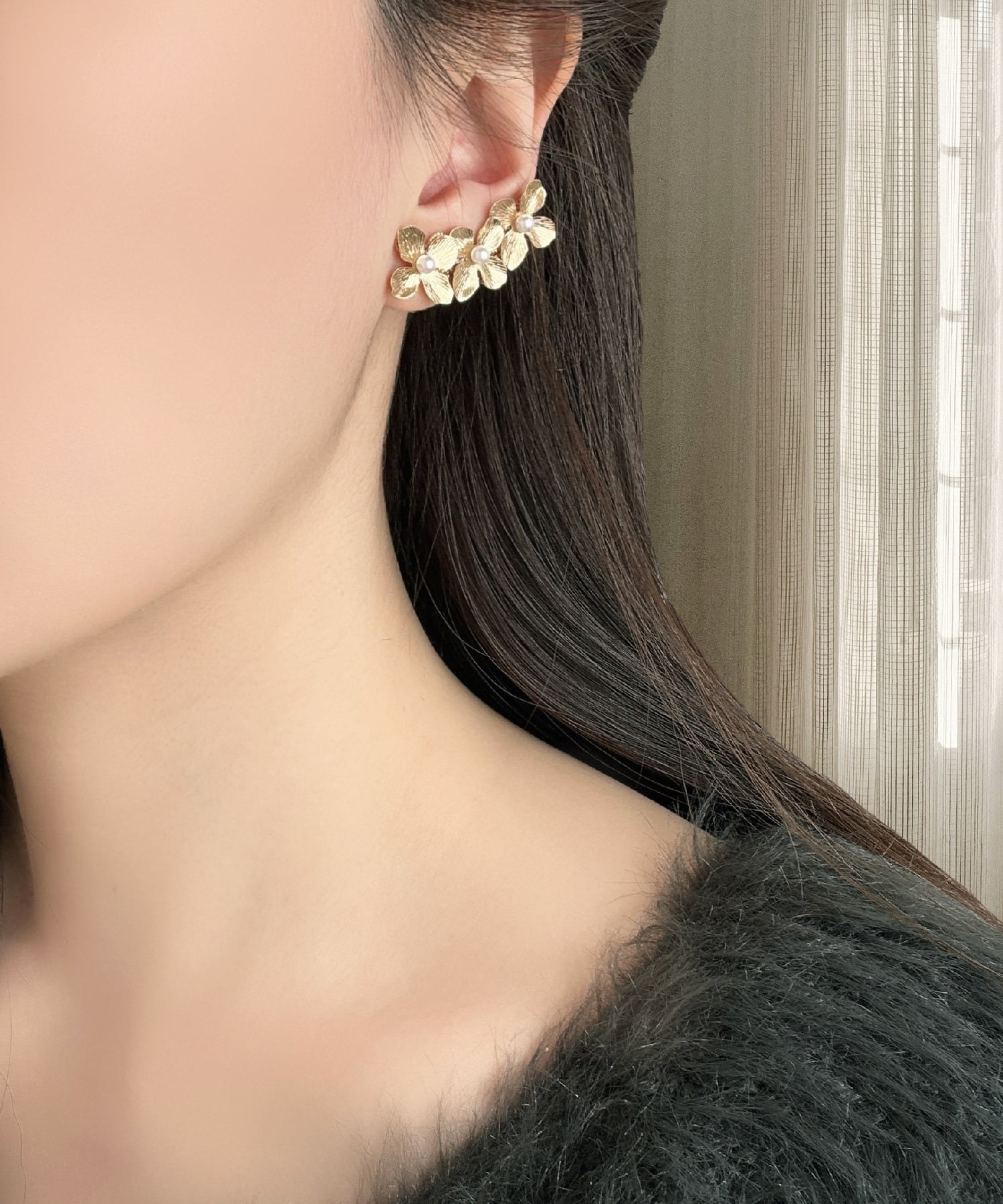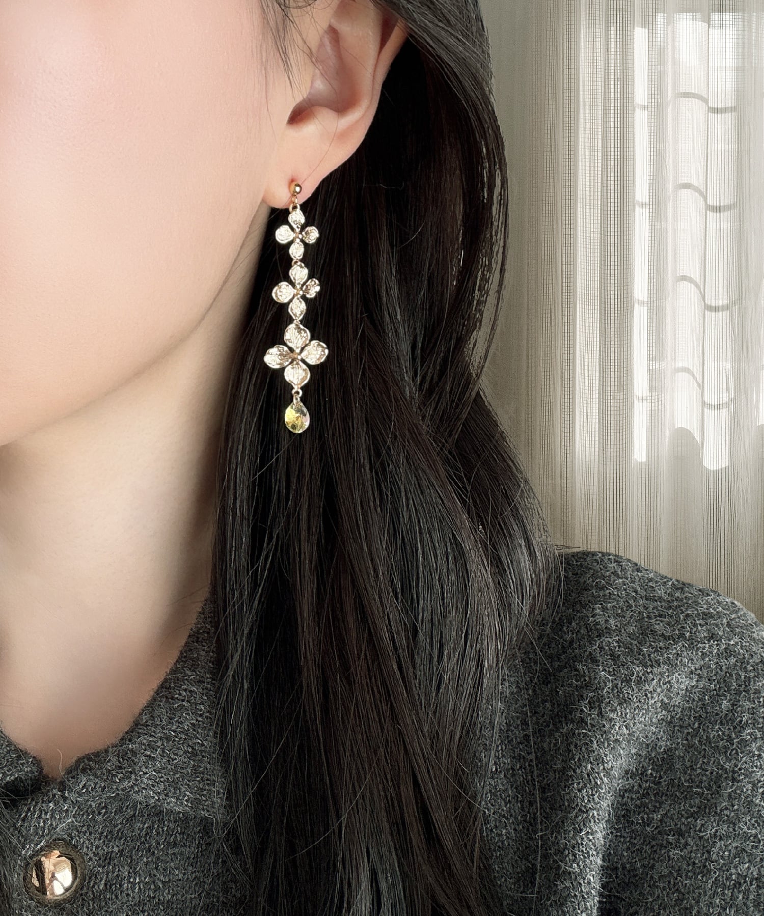 18金コーティングを施したフラワーの柔らかなゴールドの輝きと、澄んだ光を放つクリスタルが調和し、横顔をやさしく、そして凛とした印象へ導きます.